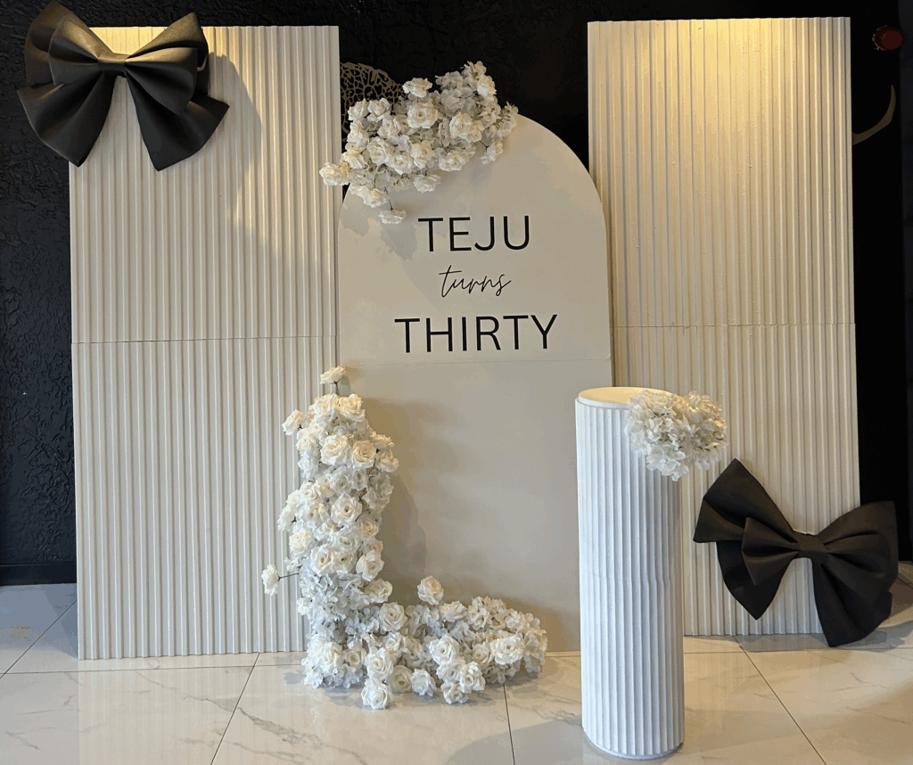 The real showstopper was the large bow-themed backdrop, which served as both a photo moment and focal point of the event. Paired with ambient lighting and white florals, it created a dreamy setting that truly captured the celebratory mood.